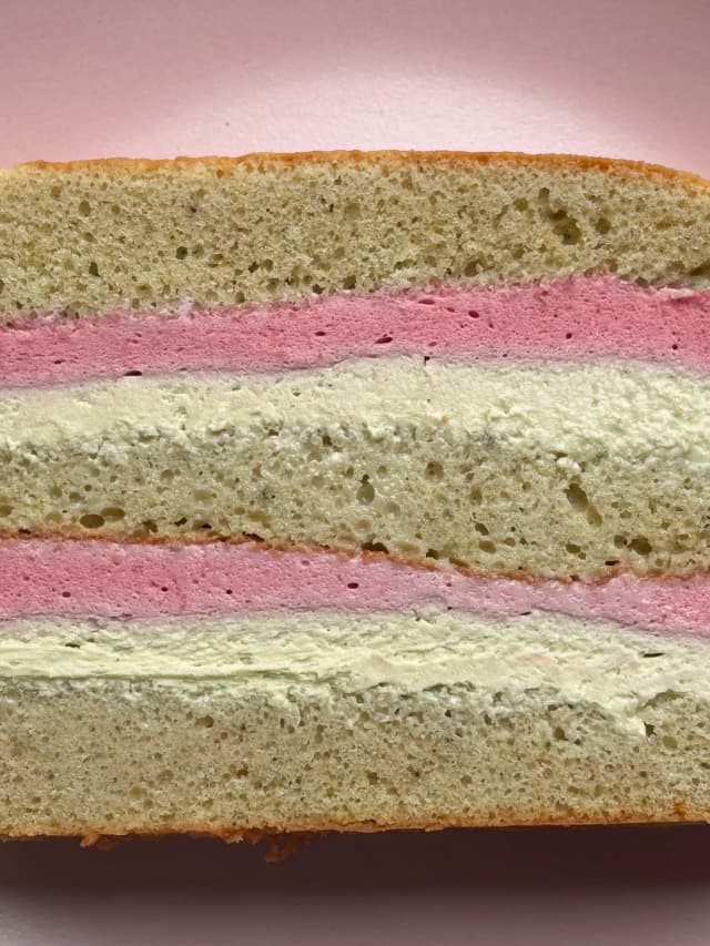 Pistáciový piškot, malinový mousse, pistáciový krém
